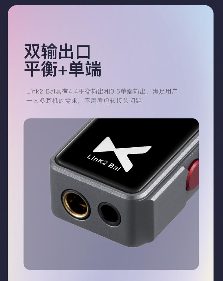 乂度 Link2 Bal 具有4. 4平衡输出和3.5单端输出,满足用户一人多耳机的需求,不用考虑转接头问题,采用转换效率85%以上的TI LM27762芯片提供超低噪声正负电,高达250mA电流输出给单端耳放电路供电,从而提供了高精度和大输出电流驱动能力保证动态输出,还原听感